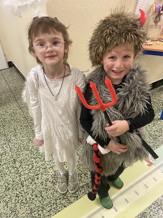 Společně navštívili děti v mateřské i základní škole, kde jim předali mikulášskou nadílku. Nechyběly básničky, písničky ani trocha čertovského strašení, které však bylo vždy vyváženo andělskou laskavostí a úsměvem.